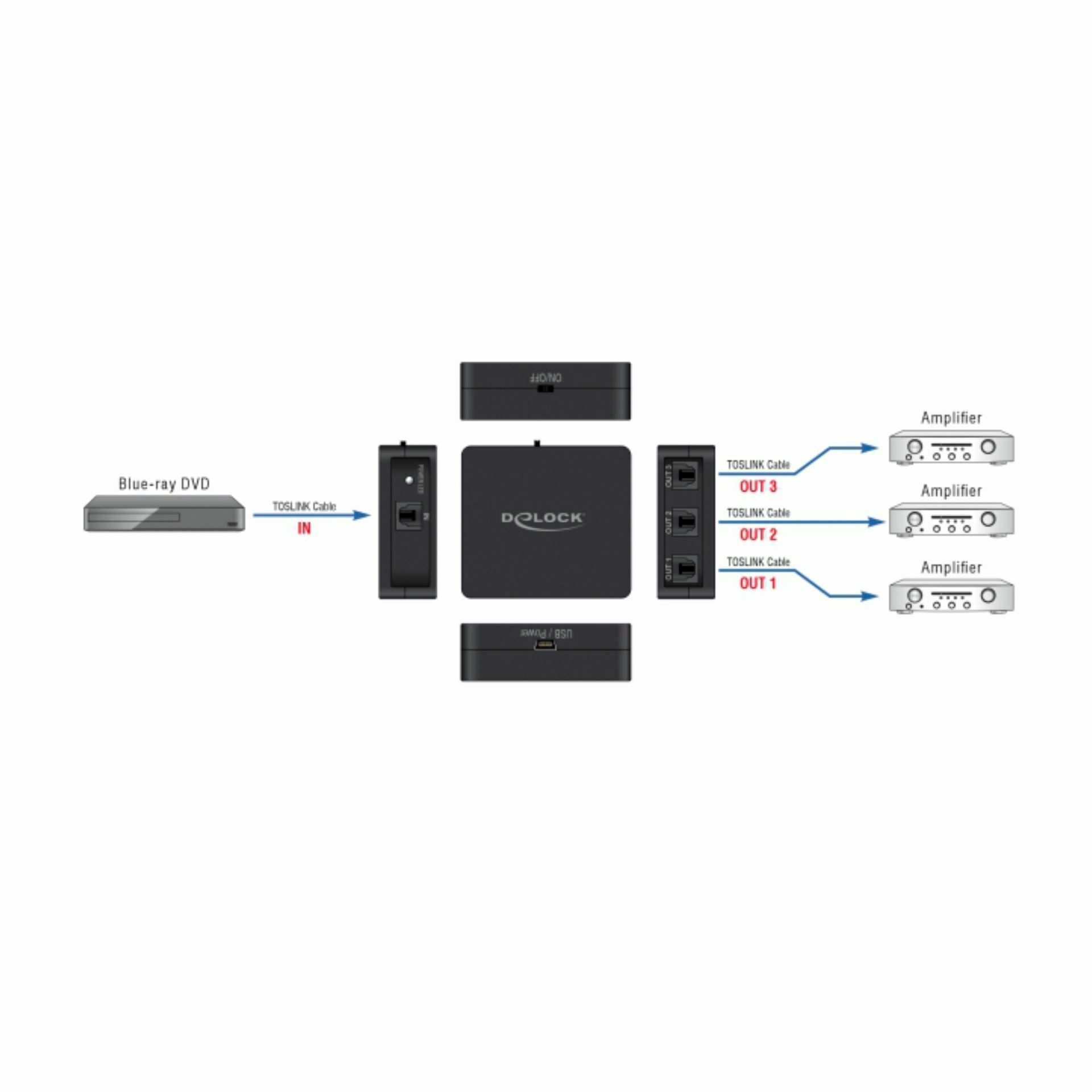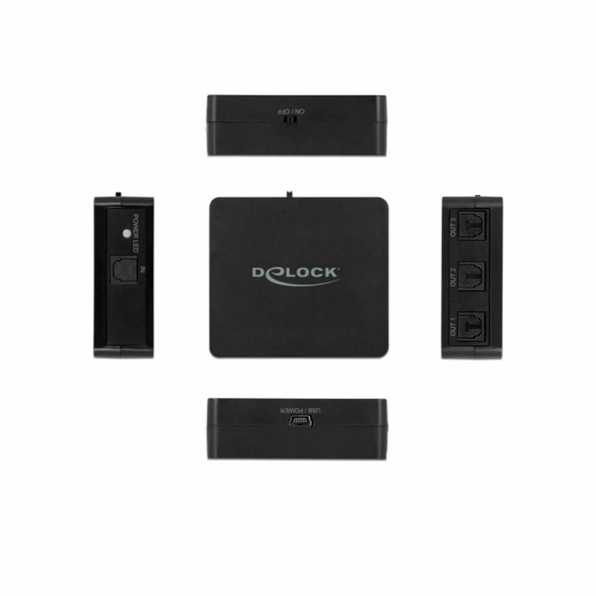 Delock Toslink stikalo omogoča, da na enem Toslink izhodu hkrati delujejo do tri Toslink naprave. Podpira zvočne formate HD, zato ponuja zvočno izkušnjo kot v kinu. Zagotavlja visoko kvaliteto zvoka in sicer do 24 bitov in 96 kHz ter veliko razdaljo prenosa (40 m). Napajanje poteka enostavno, preko priloženega USB kabla.