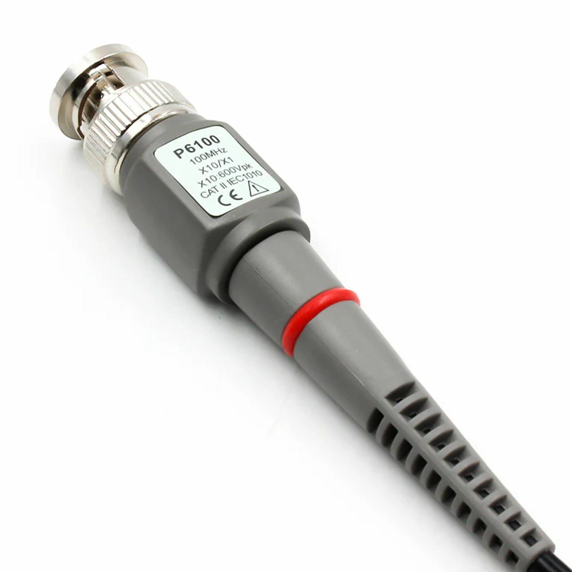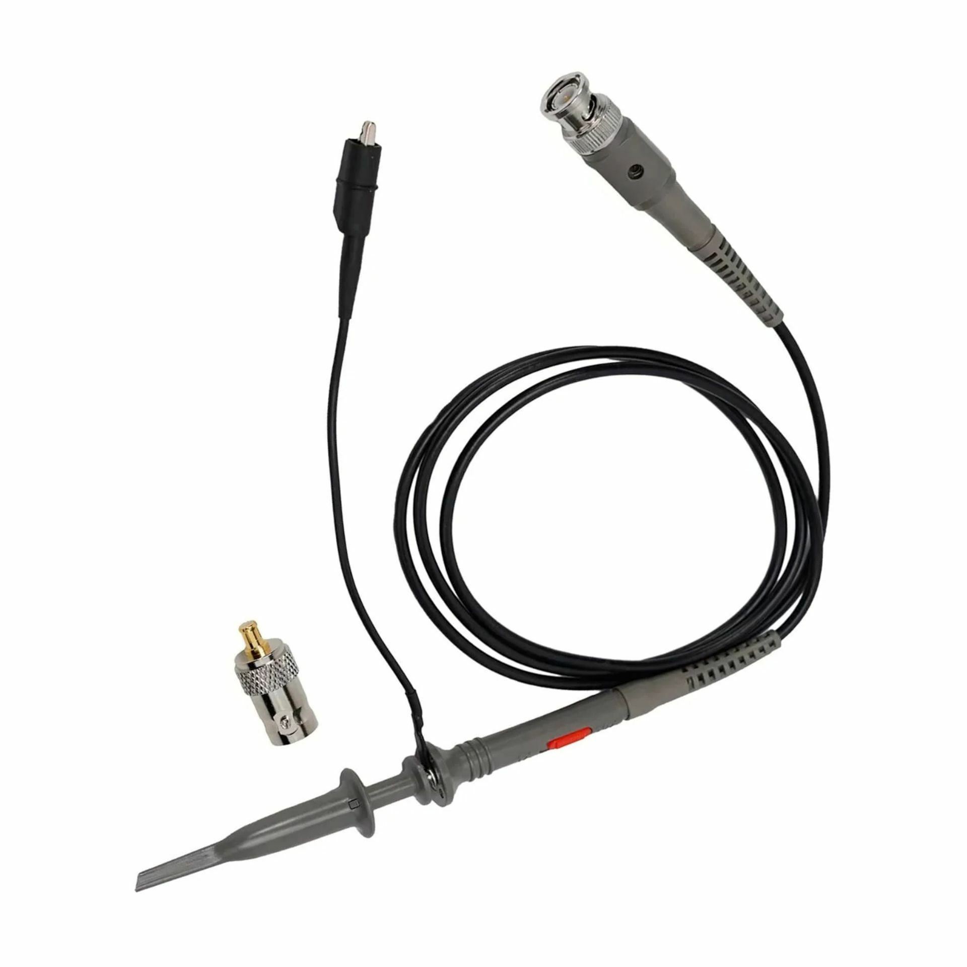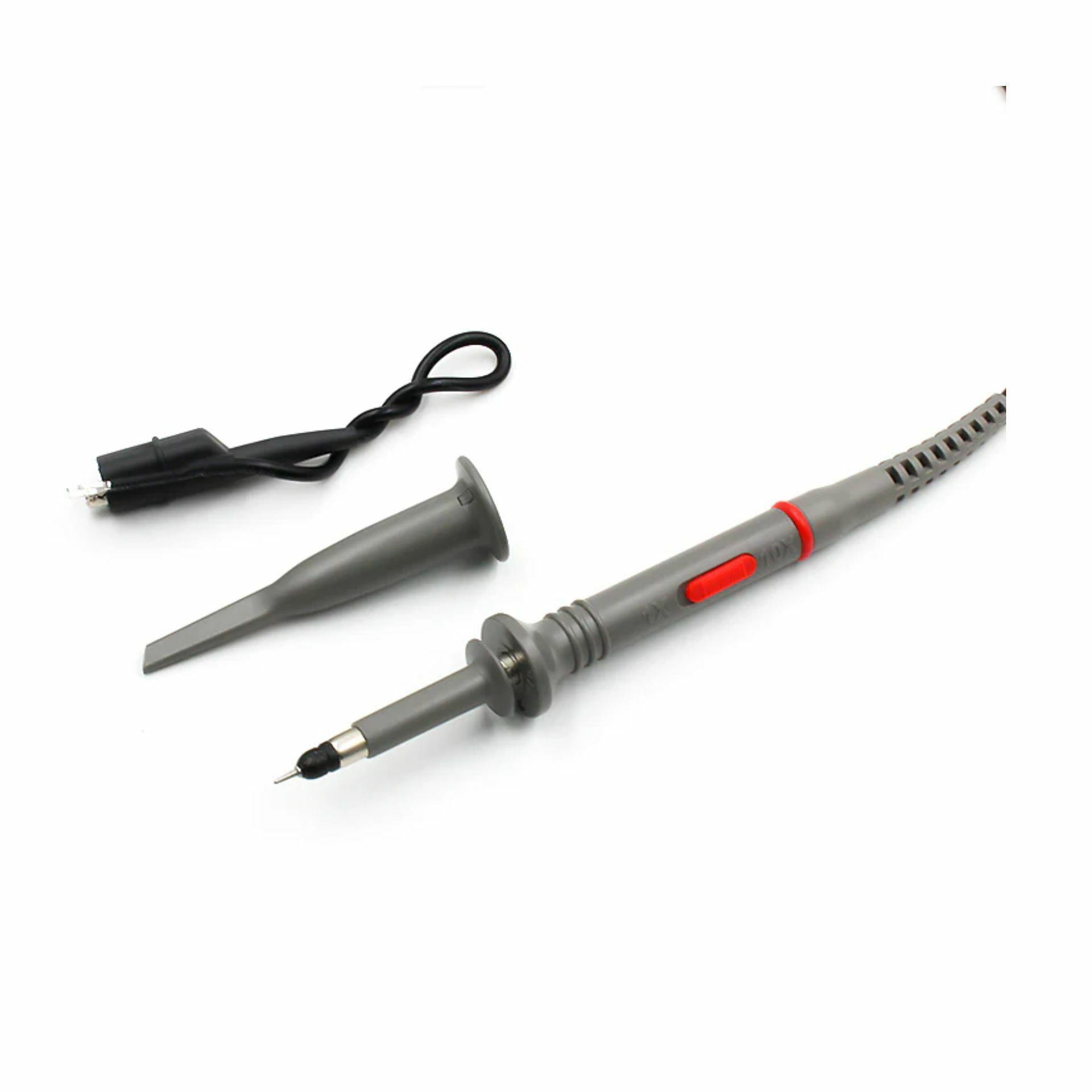 FNIRSI P6100 je osciloskopska sonda DC-100 MHz z razmerjem dušenja 1:10, vhodno odpornostjo 1 MΩ in kapaciteto 18,5–120 pF. Dolžine 120 cm, črne barve, primerna za uporabo z modeli osciloskopov DSO-TC2, DSO-TC3, DSO-152 in DSO-153.