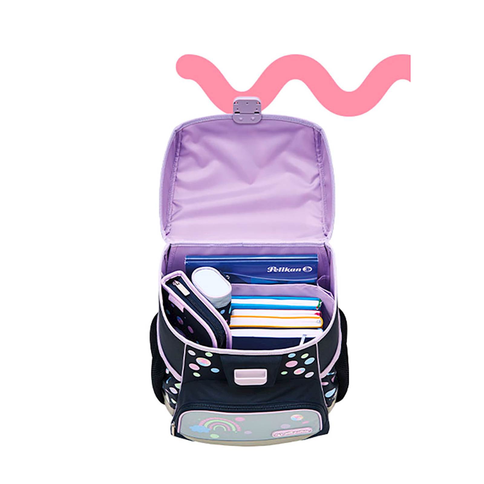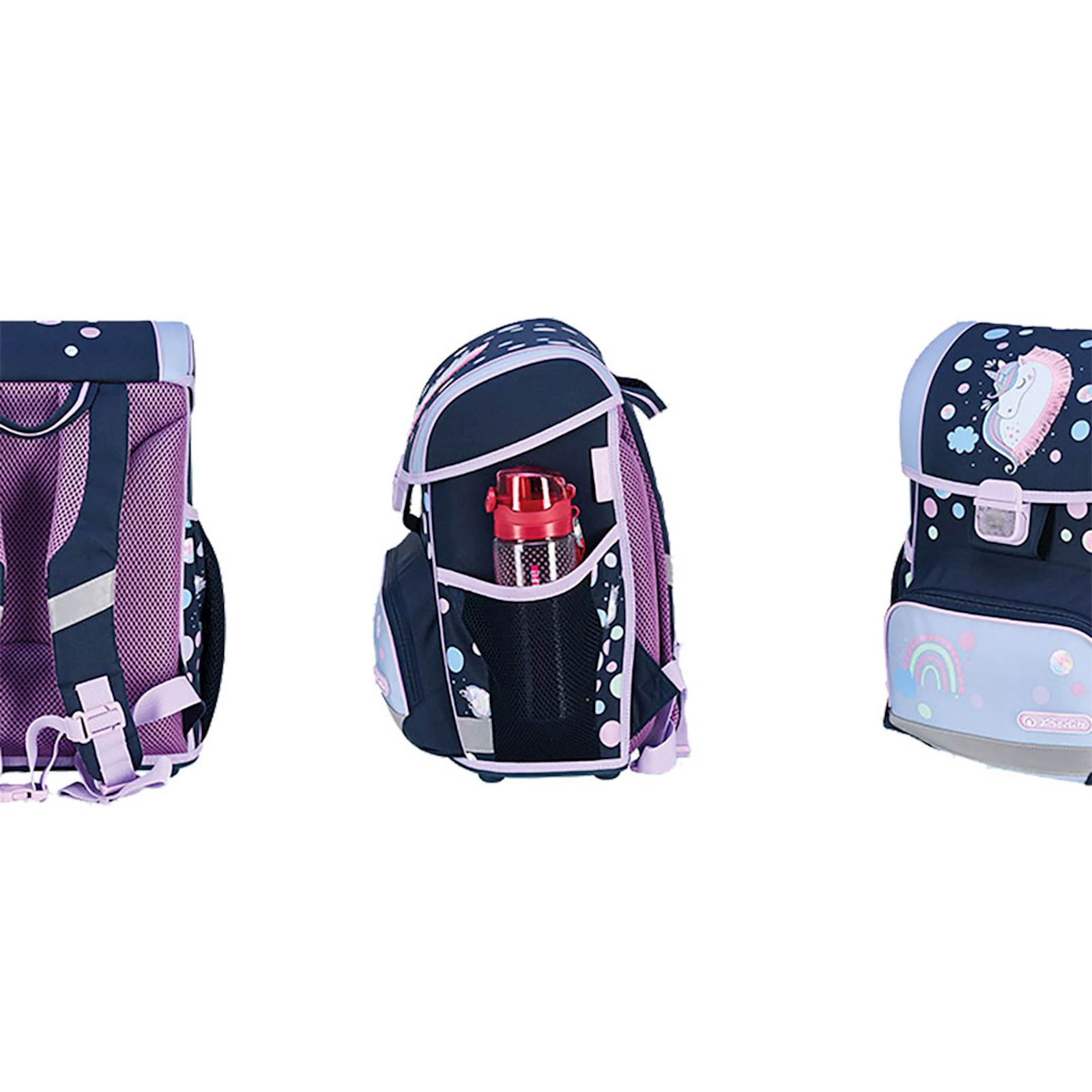 Šolska torba Loop je opremljena z ergonomsko oblikovanim hrbtiščem, ki je izdelano iz zračno prepustnega materiala za zagotavljanje udobja med nošenjem. Naramnice so mehko podložene, kar dodatno prispeva k udobnosti nošenja. Torbo lahko enostavno zapnete s zaponko z odbojno svetlobo, kar povečuje varnost v slabših svetlobnih pogojih. Ima dva odprta stranska žepa z elastiko, ki omogočata shranjevanje steklenic ali drugih manjših predmetov, ter sprednji žep z zadrgo za varno shranjevanje dodatnih predmetov. Pregrada znotraj torbe organizira prostor, kar vam omogoča urejeno shranjevanje šolskih potrebščin. Torba stoji stabilno, saj je opremljena s plastično podlago. Material, iz katerega je izdelana, je enostaven za čiščenje, kar olajša vzdrževanje torbe. Dodatna varnost je zagotovljena s prisotnostjo odsevnega materiala na sprednjih, stranskih žepih in naramnicah, kar omogoča boljšo vidljivost v temi. Torba meri 37 x 31 x 22 cm in tehta manj kot 1 kg, kar jo naredi lahko in enostavno za nošenje.