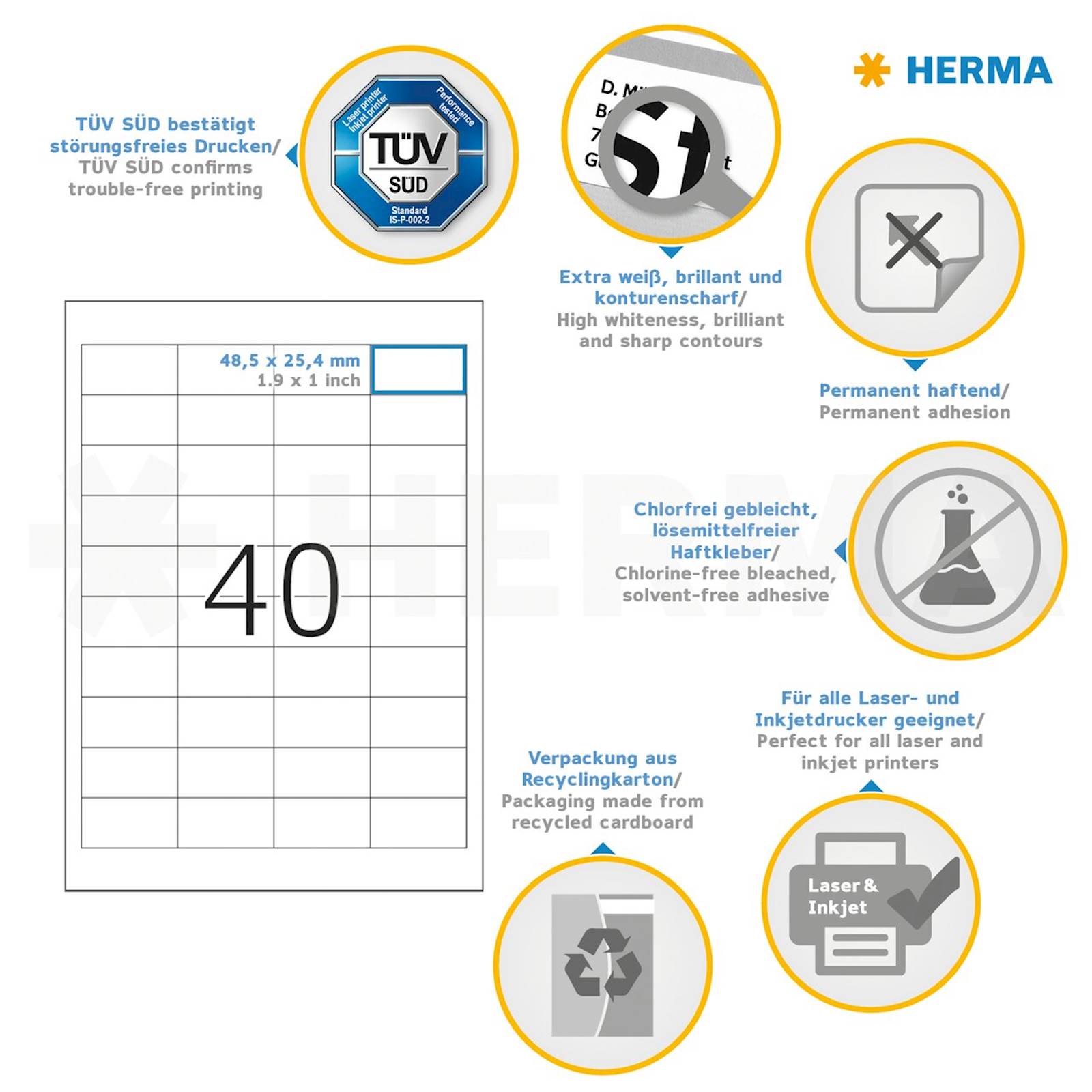 Samolepilne etikete na A4 listih, trajno lepljenje. Popolne za vse laserske in brizgalne tiskalnike, kopirne stroje, barvne laserske tiskalnike in barvne kopirne stroje. Zagotovljeno, da se ne zagozdijo, zahvaljujoč izjemno močnemu posebnemu laminatu, popolnoma ravnim polaganjem in vsestranskim zaščitnim robom. Brezhibno tiskanje na laserskih in brizgalnih tiskalnikih, testirano in certificirano s strani TÜV SÜD. Visoka belina in enotna površina za popoln tisk v črno-belem ali barvnem tisku. Opazno debelejše ter izjemno močne etikete, enostavne za pritrditev. Zelo hiter, zanesljiv oprijem tudi na hladnih, vlažnih površinah. Prijazno do okolja in trajnostno: beljeno brez klora, certificirano FSC® Mix Credit lepilo brez topil. Etikete so 100% reciklirane, odvrzite jih kot odpadni papir, embalaža je iz recikliranega kartona.