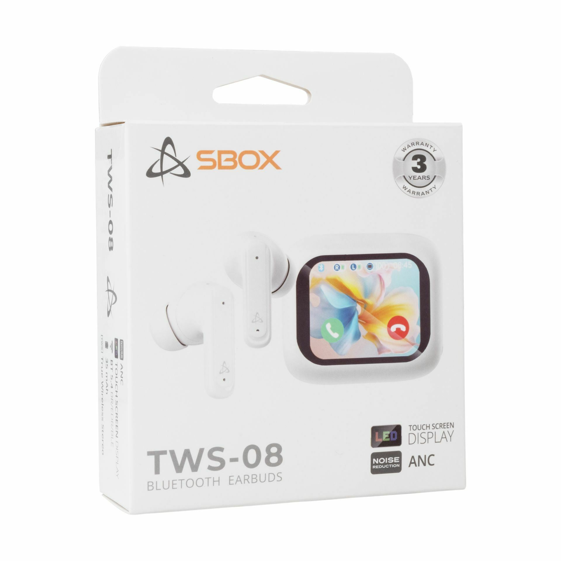 Paket vsebuje: 1x SBOX slušalke bele bluetooth z mikrofonom ANC LCD zaslon EB-TWS08-W, 1x USB polnilni kabel, 1x Navodila