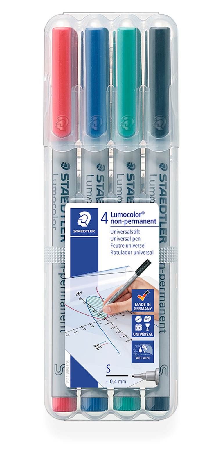 Univerzalno pisalo za uporabo na prosojnicah in skoraj vseh drugih površinah. Vsebuje hitro sušeče, vodotopno črnilo, ki ga lahko obrišemo s prosojnice z vlažno krpo. Polipropilensko ohišje in pokrovček zagotavljata dolgo življenjsko dobo. Varen na letalu – samodejno uravnavanje pritiska preprečuje točenje. Debelina črte je približno 0,4 mm. Set vsebuje 4 flomastre v PVC etuiju.