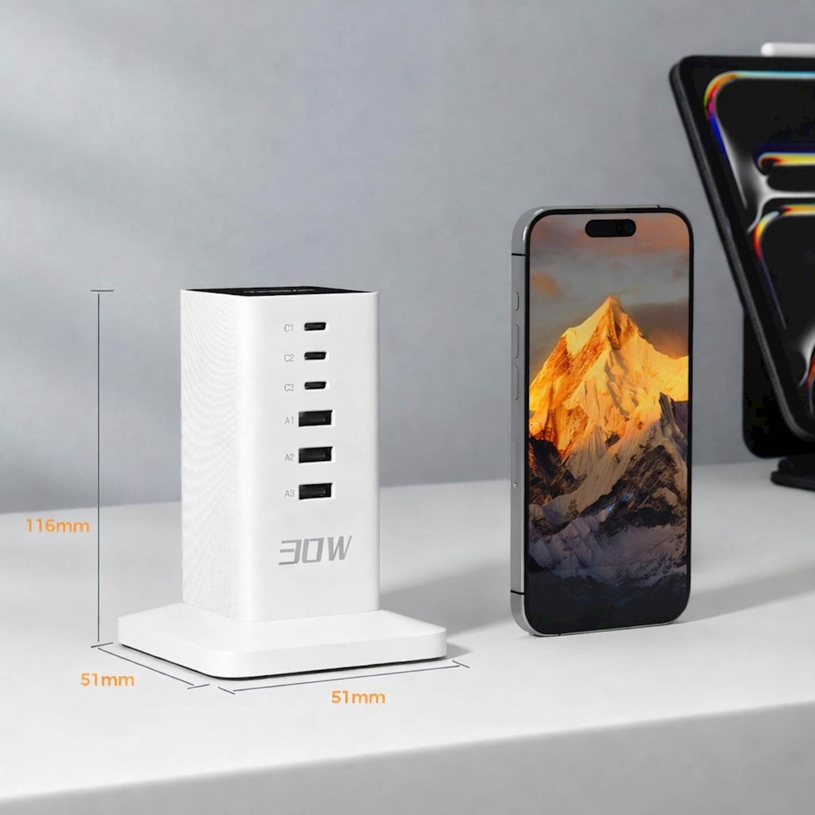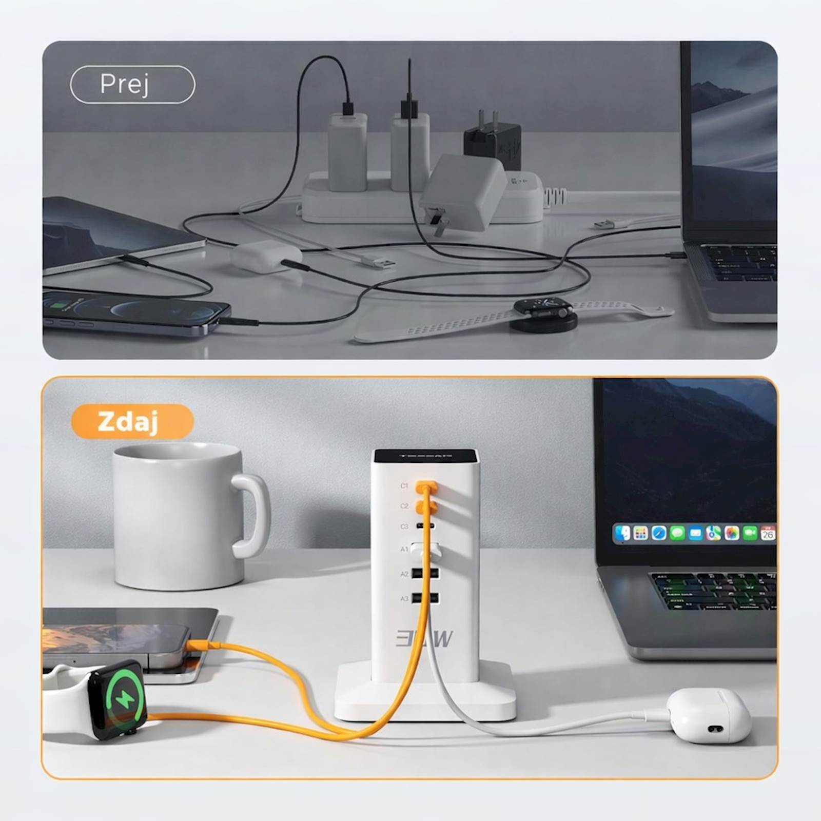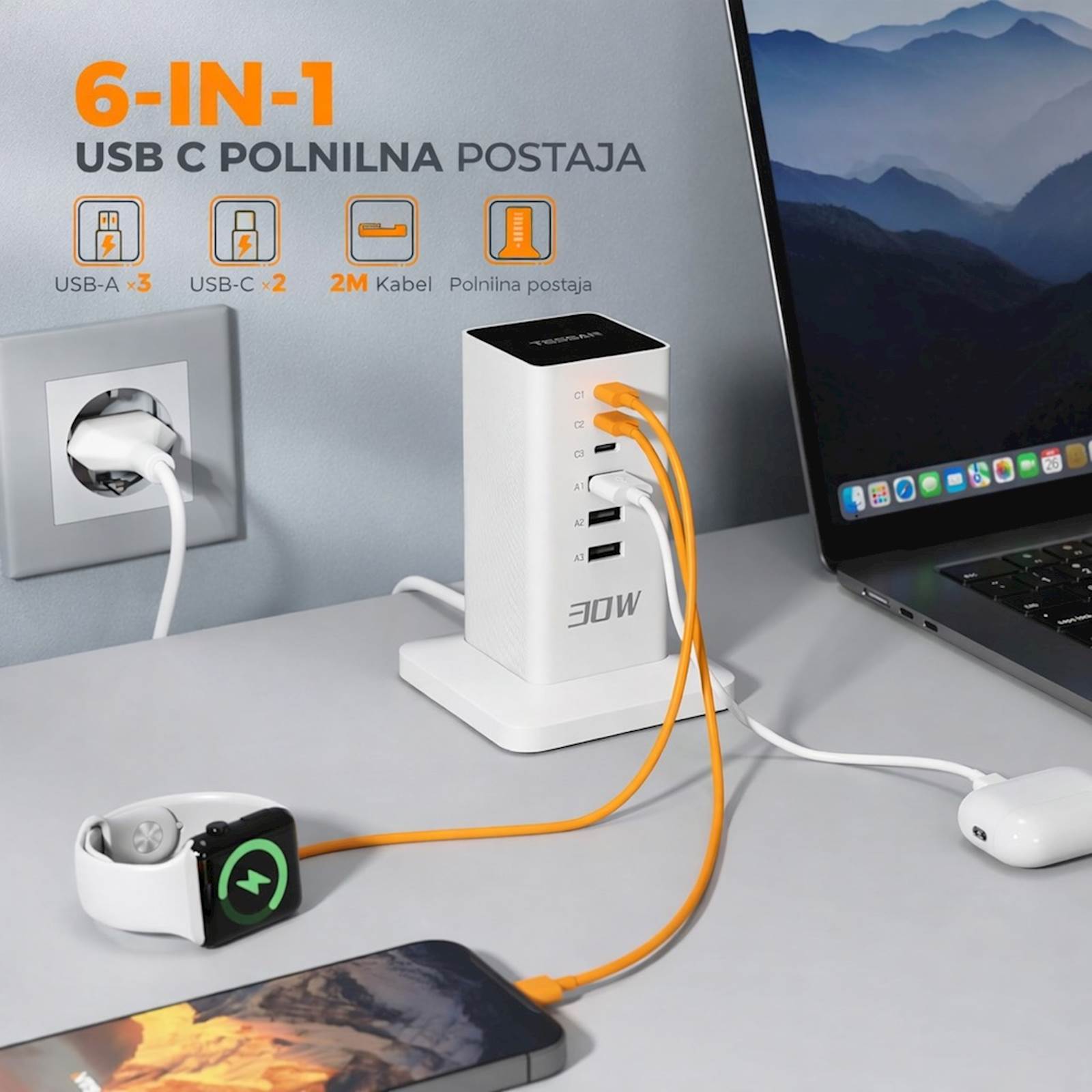 Tessan CS04-EU-WH namizna polnilna postaja je 6-v-1 rešitev s tremi USB-C in tremi USB-A vhodi ter skupno močjo 30 W, namenjena polnjenju več naprav hkrati. Prostorsko varčna navpična zasnova prihrani prostor na mizi, tehnologija Smart-Flow in vgrajene varnostne zaščite pa zagotavljajo varno in optimalno polnjenje. Vsestranska polnilna postaja za dom in pisarno Polnilni adapter omogoča hkratno polnjenje več naprav. Opremljen je s tremi USB-C priključki (skupno 15 W, do 5 V/3 A na vhod) in tremi USB-A priključki (skupno 12 W, do 5 V/2,4 A na vhod), kar je primerno za telefone, slušalke, pametne ure in druge USB naprave. Navpična zasnova prihrani prostor, protizdrsna podlaga pa zagotavlja stabilnost. Pri uporabi treh ali več priključkov skupna izhodna moč znaša 30 W. Tehnologija Smart-Flow samodejno prilagodi tok za optimalno polnjenje vsake naprave. Vgrajene varnostne funkcije ščitijo pred prenapetostjo, nadtokom, pregrevanjem in kratkim stikom. Kompaktna in lahka zasnova ter 2 m dolg kabel omogočata enostavno uporabo tudi na poti. Primerna je za urejeno delovno okolje doma ali v pisarni. Glavne lastnosti 6-v-1 polnilni adapter (3× USB-C, 3× USB-A) Skupna izhodna moč 30 W Tehnologija Smart-Flow za optimalno polnjenje Vgrajene varnostne zaščite Prostorsko varčna navpična zasnova Kompakten in lahek, primeren za potovanja 2 m dolg kabel Tehnične podrobnosti Tip:USB polnilna postaja USB vhodi:3× USB-C (skupno 15 W, max 5 V/3 A na vhod); 3× USB-A (skupno 12 W, max 5 V/2,4 A na vhod) Skupna izhodna moč:30 W (pri uporabi 3+ priključkov) Varnost:Zaščita pred prenapetostjo; zaščita pred nadtokom; zaščita pred pregrevanjem; zaščita pred kratkim stikom Dolžina kabla:2 m Zasnova:Navpična, protizdrsna Garancija:2 leti