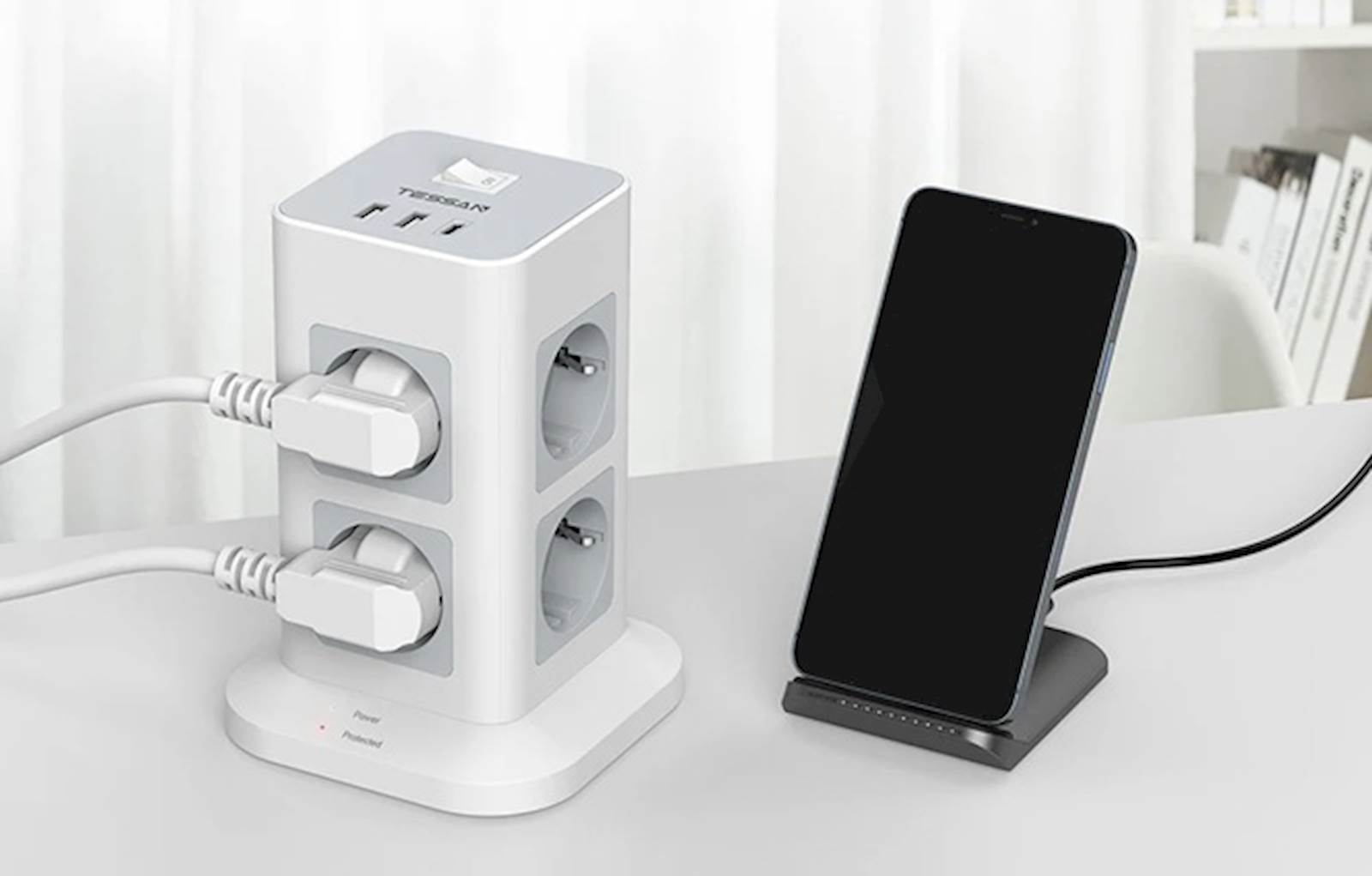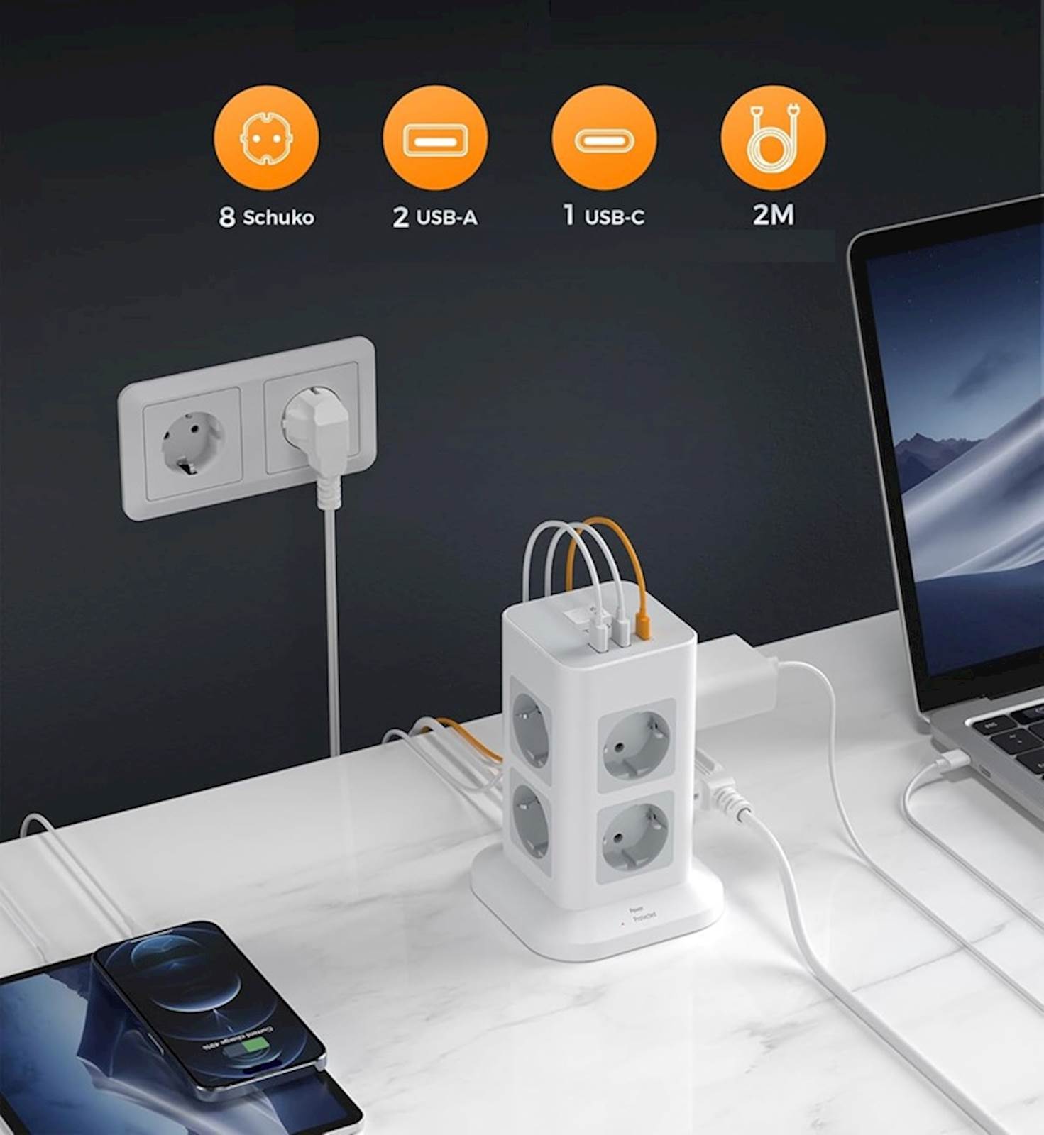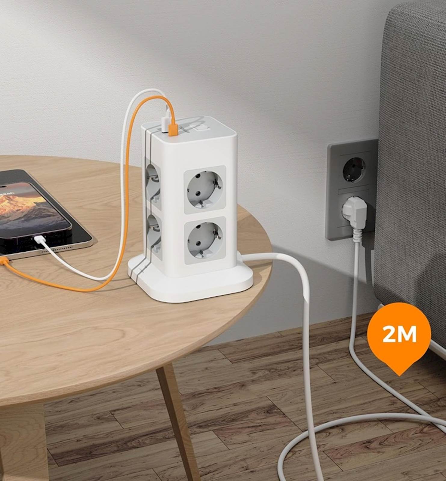 Tessan TPS03-DE-C stolpna razdelilna vtičnica Razdelilec v obliki stolpa ponuja osem AC vtičnic ter dva USB-A in en USB-C vhod za polnjenje več naprav hkrati. Za varnost skrbi prenapetostna zaščita (1700 J) in zaščita pred preobremenitvijo, 2-metrski kabel in stikalo pa zagotavljata priročno uporabo. Vsestranski razdelilec z USB priključki Razdelilec v obliki stolpa omogoča priklop številnih naprav hkrati, njegova zasnova pa prihrani prostor in olajša organizacijo kablov na mizi ali pod njo. Opremljen je s tremi USB priključki: dvema USB-A vhodoma (do 2,4 A na vhod) in enim USB-C vhodom (do 3 A), ki so idealni za polnjenje telefonov, tablic in drugih mobilnih naprav brez dodatnih polnilcev. Za varnost vaših naprav skrbita vgrajena prenapetostna zaščita (1700 J) in zaščita pred preobremenitvijo (16 A). Ohišje je izdelano iz ognjevarnega materiala (do 750°C), stikalo pa omogoča enostaven izklop vseh priključenih naprav. Dolg 2-metrski kabel zagotavlja prilagodljivost pri postavitvi. Glavne lastnosti 8 AC vtičnic 2 USB-A vhoda (do 2,4 A) 1 USB-C vhod (do 3 A) Prenapetostna zaščita (1700 J) Zaščita pred preobremenitvijo (16 A) Stikalo za vklop/izklop 2 m dolg kabel Ognjevaren material Tehnične podrobnosti Tip:Razdelilec v obliki stolpa Število AC vtičnic:8 USB vhodi:2× USB-A (5 V / 2,4 A max na vhod), 1× USB-C (5 V / 3 A) Maksimalna moč:3600 W (16 A, 230 V) Prenapetostna zaščita:1700 J Zaščita pred preobremenitvijo:16 A Dolžina kabla:2 m Stikalo:Da vMaterial:Ognjevaren (do 750°C) Garancija:2 leti