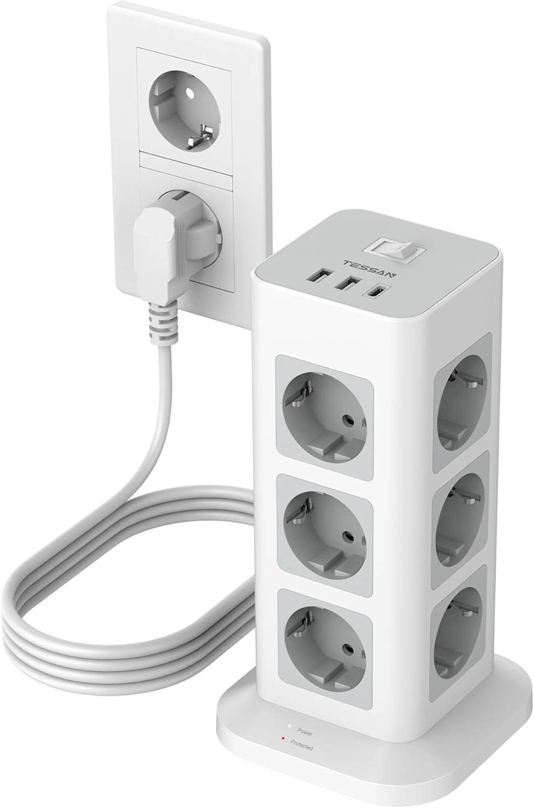 Tessan TS-TPS04-DE stolpna razdelilna vtičnica TESSAN 15-v-1 razdelilnik z USB C in 12 vtičnicami omogoča varno, praktično in prostor prihranjujoče polnjenje ter napajanje več naprav hkrati. Opis Razdelilec z USB-C, 2 USB-A in 12 standardnimi vtičnicami je zasnovan kot stolp, kar prihrani prostor in omogoča preprost dostop do vseh priključkov. S tremi USB izhodi in USB C priključkom lahko hkrati polnite mobilne telefone, tablice ali druge USB naprave, ne da bi zasedli dodatne vtičnice. Vgrajena zaščita pred prenapetostjo ščiti vaše elektronske naprave pred nenadnimi sunki in napetostnimi nihanji. Naprava vključuje tudi vklop/izklop stikalo z mehko LED indikacijo ter stabilne gumijaste nogice, ki preprečujejo premikanje razdelilnika, kar zagotavlja varno in udobno uporabo doma, v pisarni ali v študentski sobi. Ključne lastnosti 12 standardnih vtičnic 1 × USB-C in 2 × USB-A priključka Stolpna zasnova za prihranek prostora Zaščita pred prenapetostjo Vklop/izklop stikalo z LED indikatorjem Stabilne gumijaste nogice Tehnične specifikacije Barva:Bela, Siva Skupno število vtičnic:12 USB priključki:2 × USB A (max 2,4 A vsak), 1 × USB C (max 3 A) Zaščita pred prenapetostjo:7.500 A Maksimalna moč:3.600 W Dolžina kabla:2 m Dimenzije izdelka:22 × 11,4 × 11,4 cm Indikator:Mehka bela LED lučka (ne moti spanja) Posebne funkcije:Zaščita pred prenapetostjo, vklop/izklop stikalo Dodatne funkcije:Stabilne gumijaste nogice, stolpna zasnova, prihrani prostor Garancija:2 leti