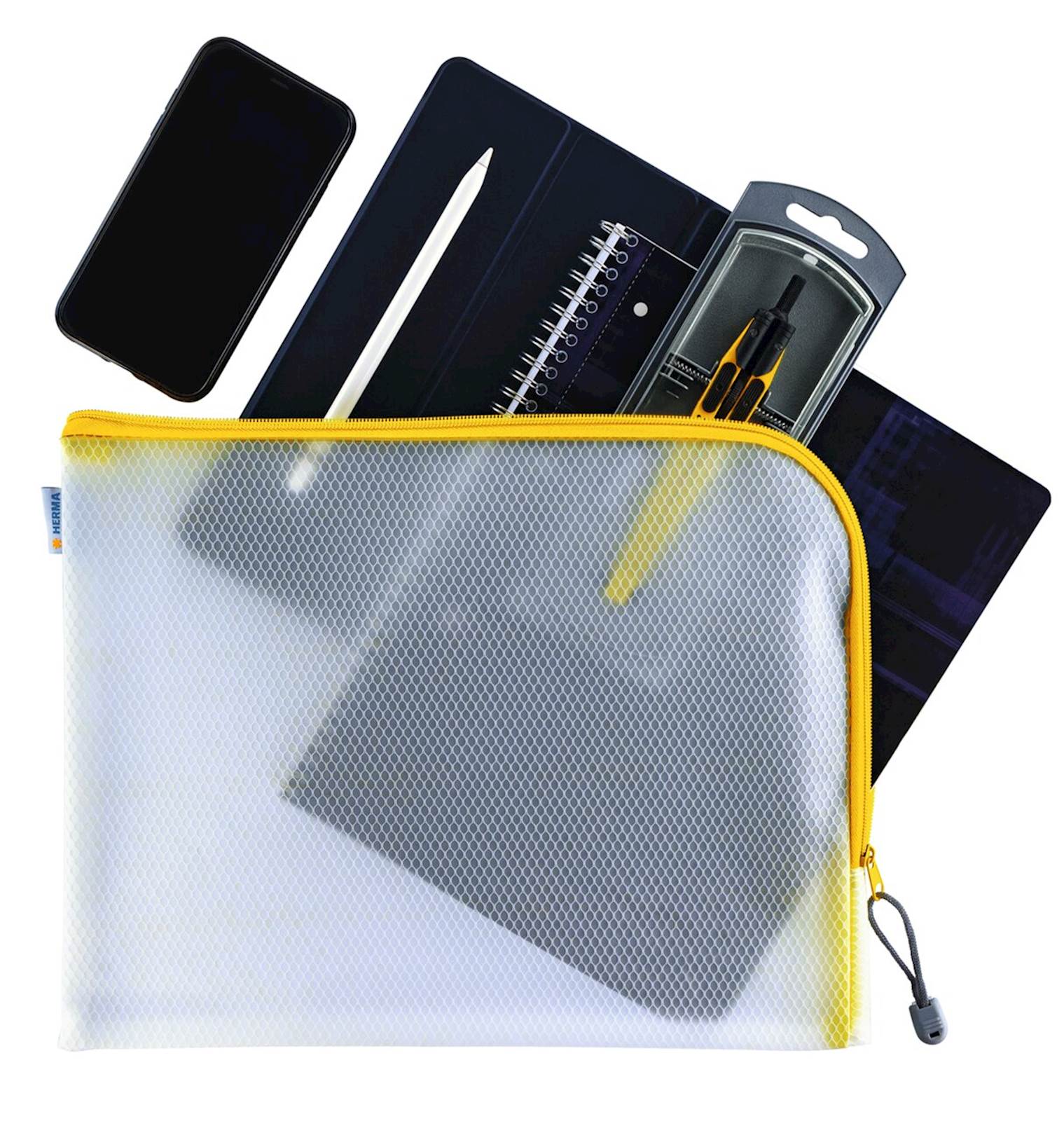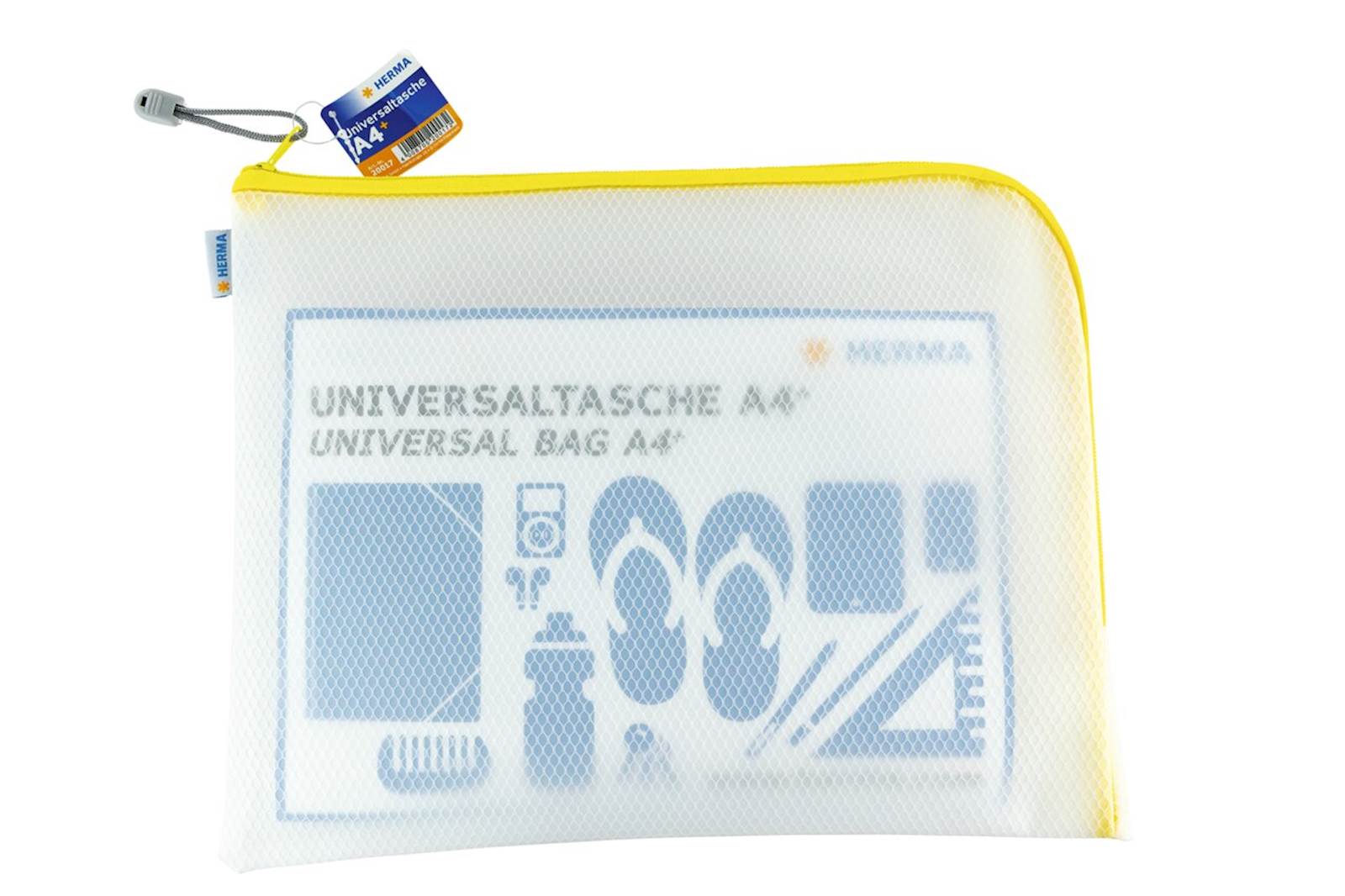 Univerzalna torbica s praktično zadrgo, rumeni robovi, 36 x 28 cm. Izdelana iz trpežnega, robustnega in vodoodpornega materiala. Zaradi vodoodpornega materiala je torbica odlična za shranjevanje na plaži, za shranjevanje kozmetike, dokumentov, za uporabo v šoli in v delavnici. Na voljo v petih barvnih različicah.