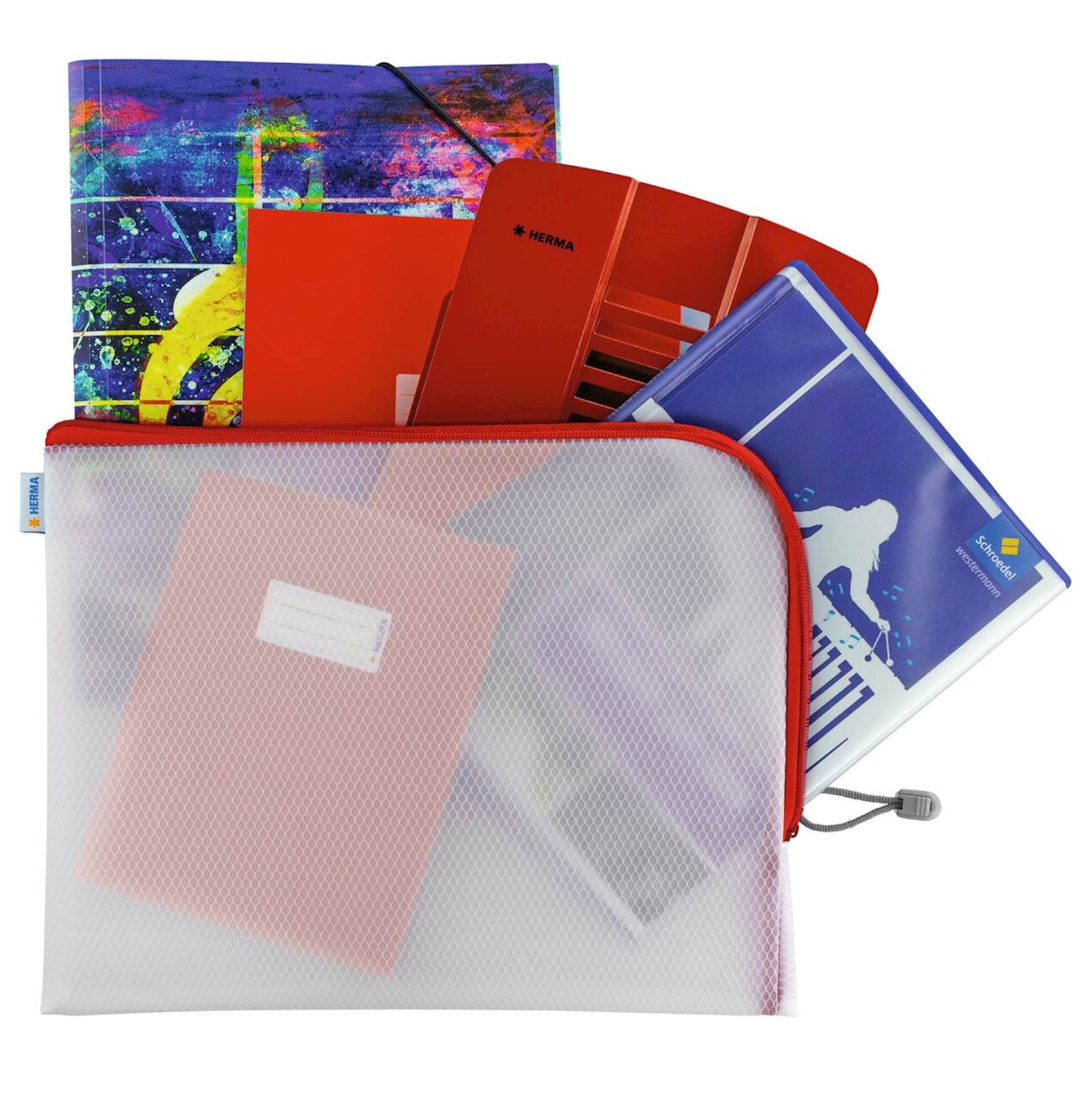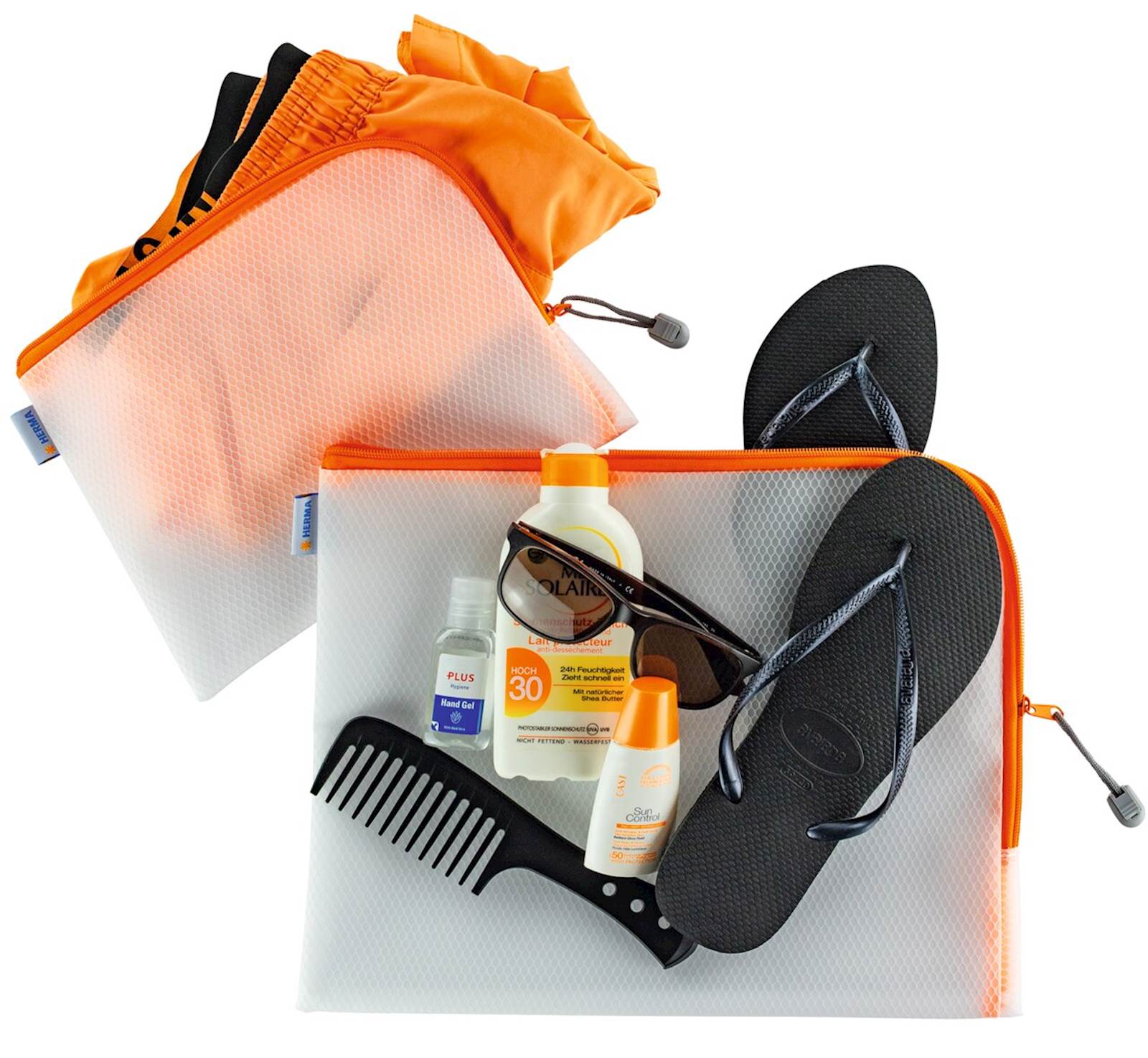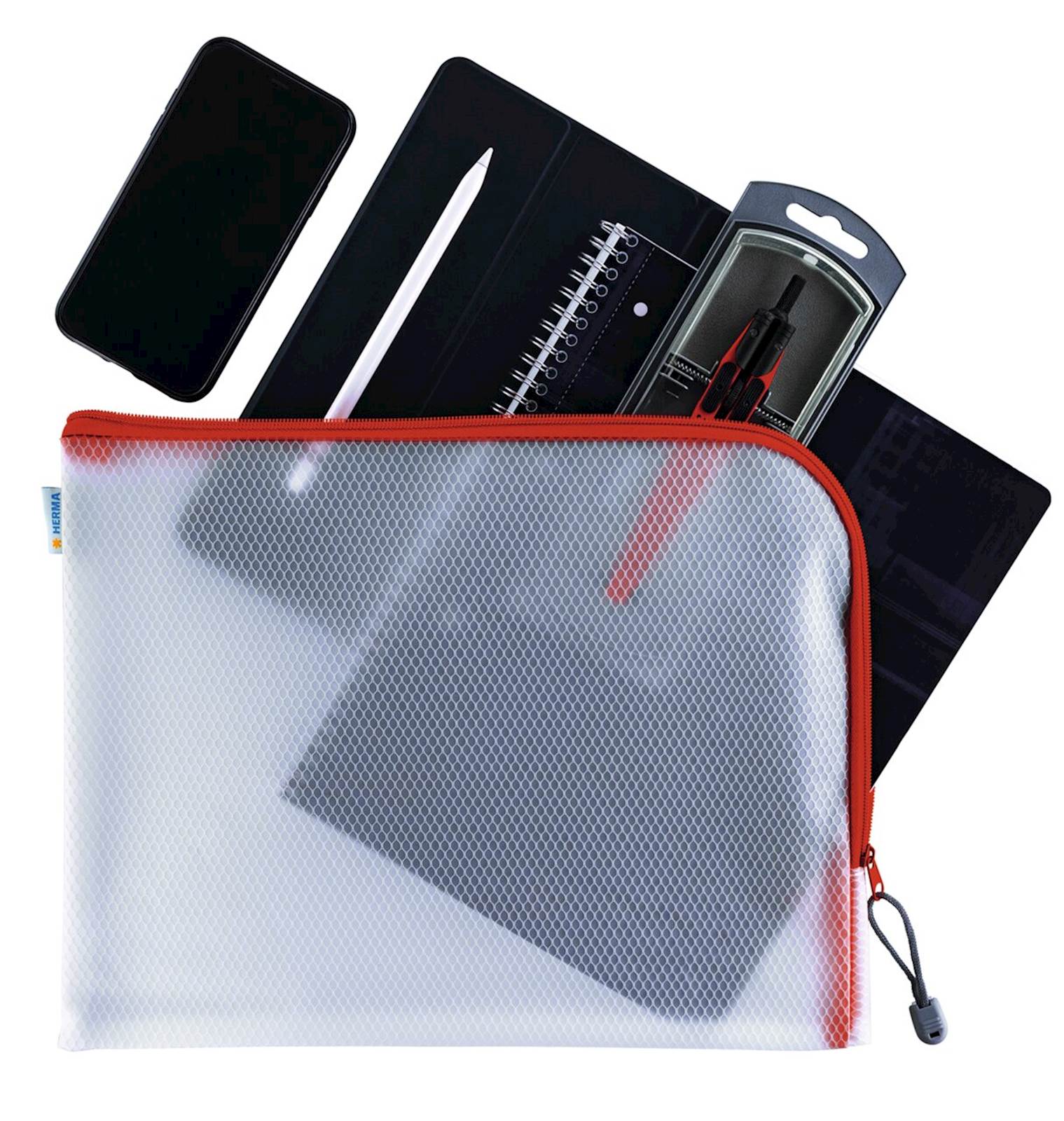 Univerzalna torbica s praktično zadrgo, rdeči robovi, 36 x 28 cm. Izdelana iz trpežnega, robustnega in vodoodpornega materiala. Zaradi vodoodpornega materiala je torbica odlična za shranjevanje na plaži, za shranjevanje kozmetike, dokumentov, za uporabo v šoli in v delavnici. Na voljo v petih barvnih različicah.