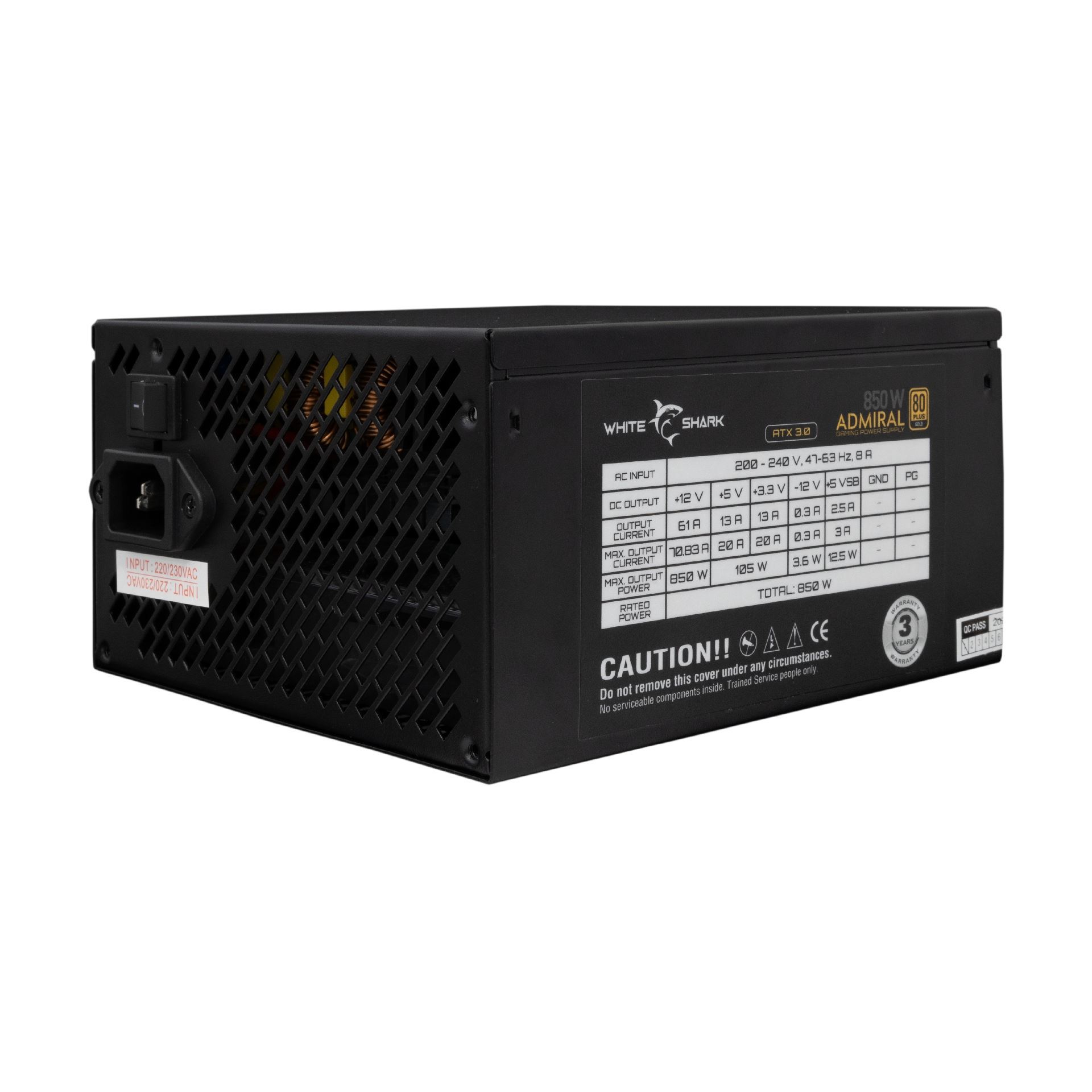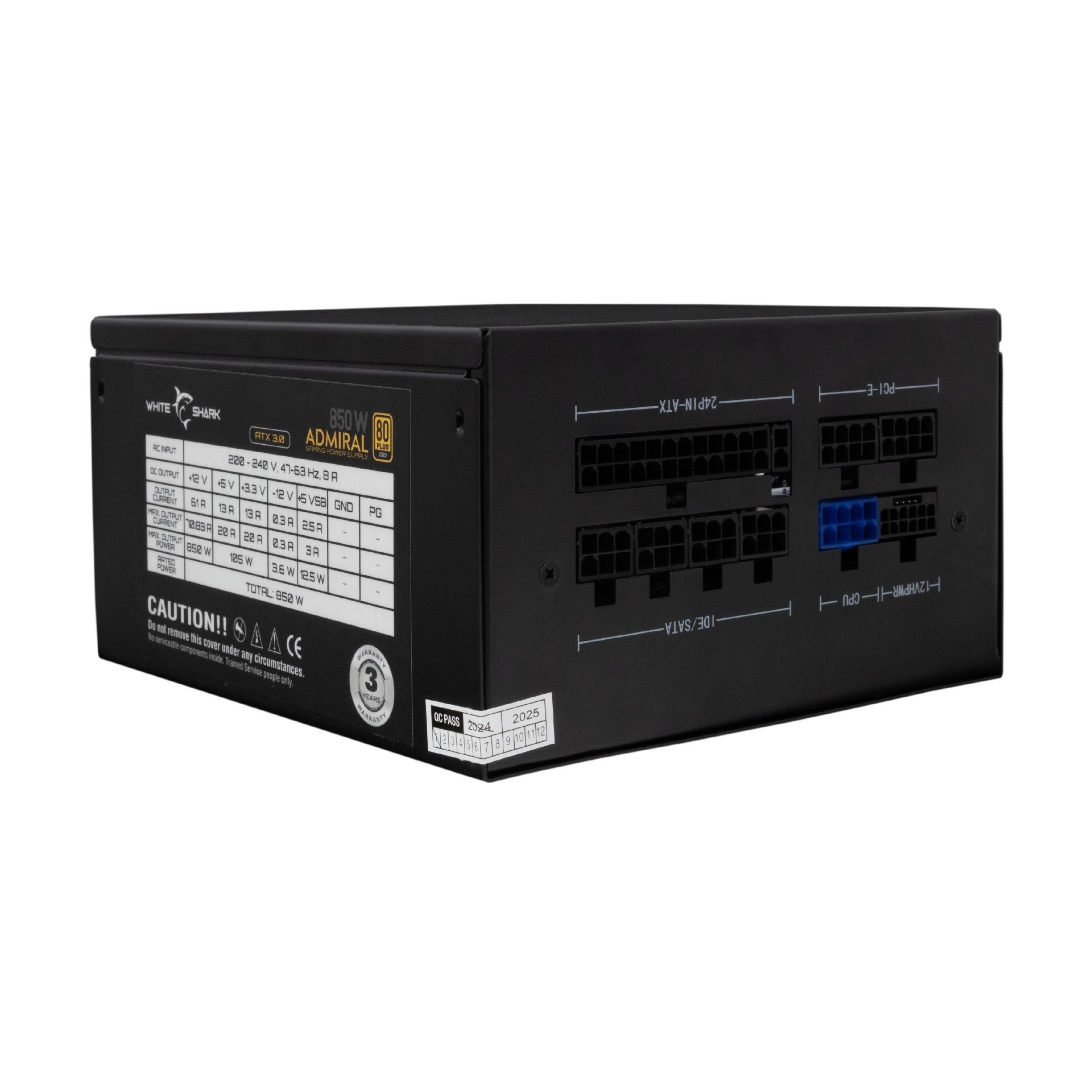 White Shark ADMIRAL 850W je popolnoma modularen ATX napajalnik visoke zmogljivosti z 80 PLUS GOLD standardom, z ventilatorjem premera 140 mm s tihim hlajenjem. Ponuja vse glavne priključke, zaščite OVP/OPP/SCP/UVP in kompaktno zasnovo za enostavno vgradnjo. Namenjen vgradnji v računalniško ohišje.